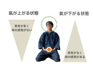 ストレスが軽減していくとことで心身の流れが良くなり、結果として「丹田」が育ちます。具体的な体感覚として、お腹に拳大のような感覚が育つのです。その状態になるとまず体内エネルギーが充足し、元氣・やる氣・根氣などの「氣エネルギー」が満たされ、次に心が満たされて充実感や自信が湧いてきます。